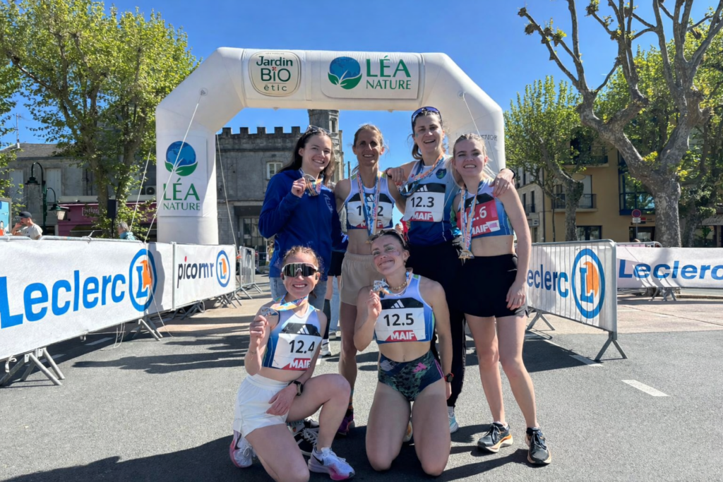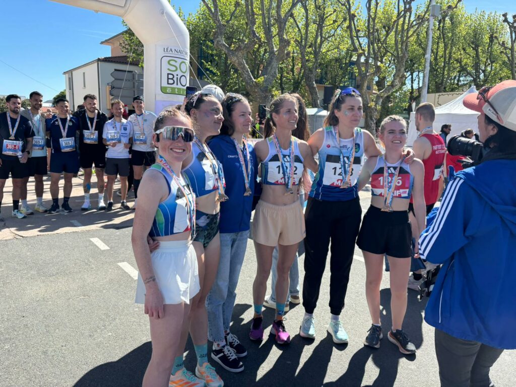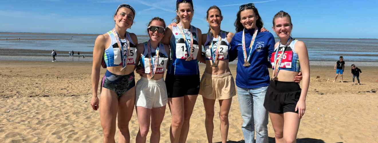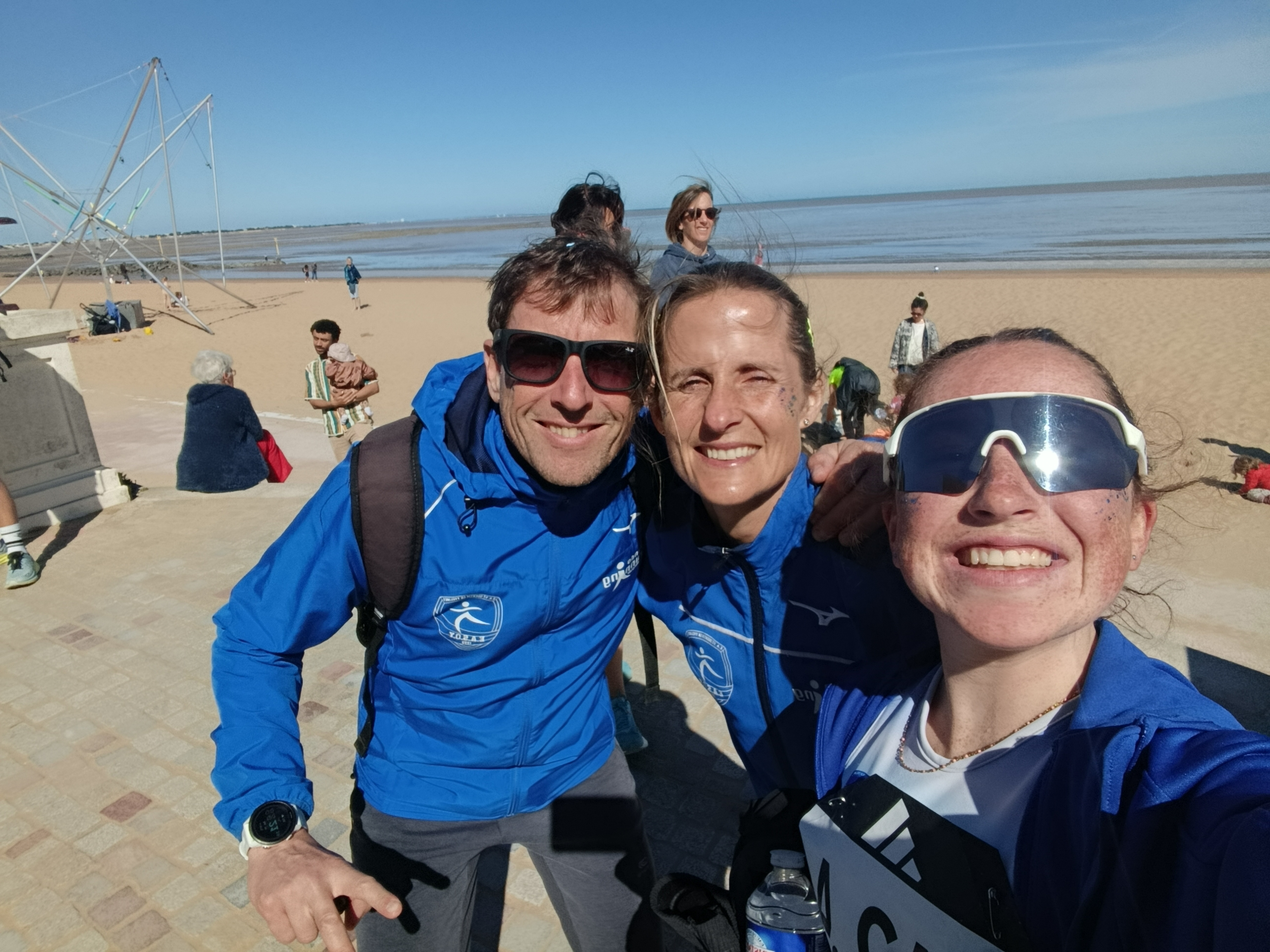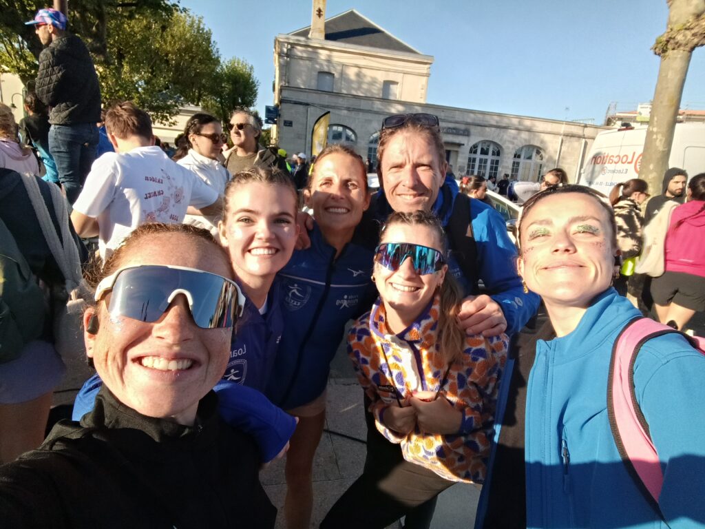 Réveil aux aurores. Les tenues sont enfilées : paillettes, étoiles et chouchous sont de sortie pour briller sur ce Championnat de France d’Ekiden. L’équipe est prête à affronter un parcours exigeant, composé de longues lignes droites, dont une en bord de mer exposée au vent, ainsi qu’un passage plus technique sur chemin de gravillons et de sable.